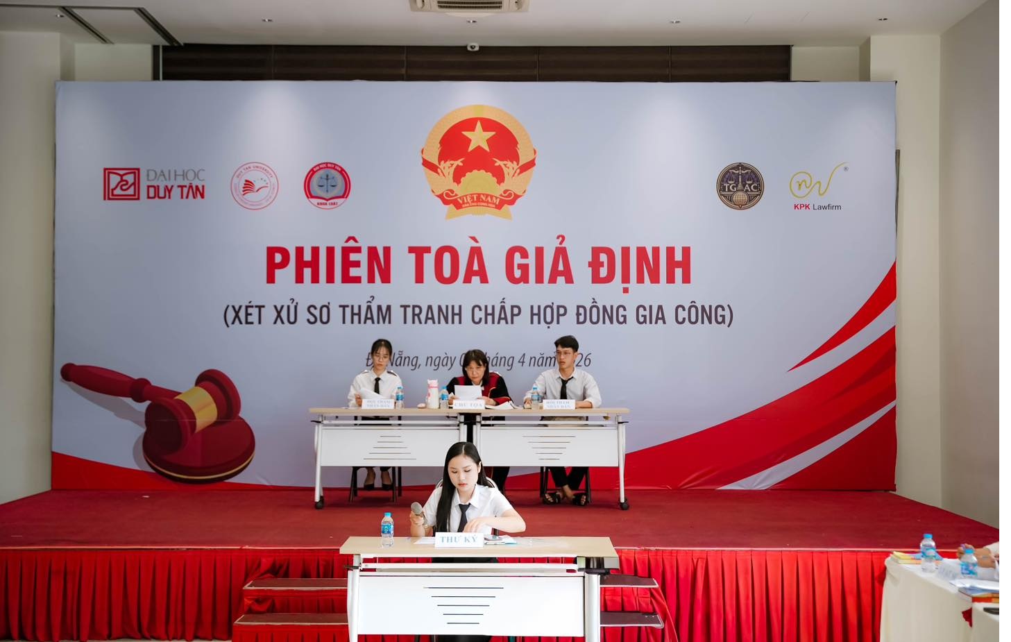 Sáng ngày 04/04/2026, tại Hội trường 105G Đại học Duy Tân (120 Hoàng Minh Thảo, Đà Nẵng), một không gian học thuật đặc biệt đã diễn ra khi các trang giáo trình khô khan được thay thế bằng không khí tranh tụng đầy kịch tính của "Phiên tòa giả định" xét xử sơ thẩm tranh chấp hợp đồng gia công.