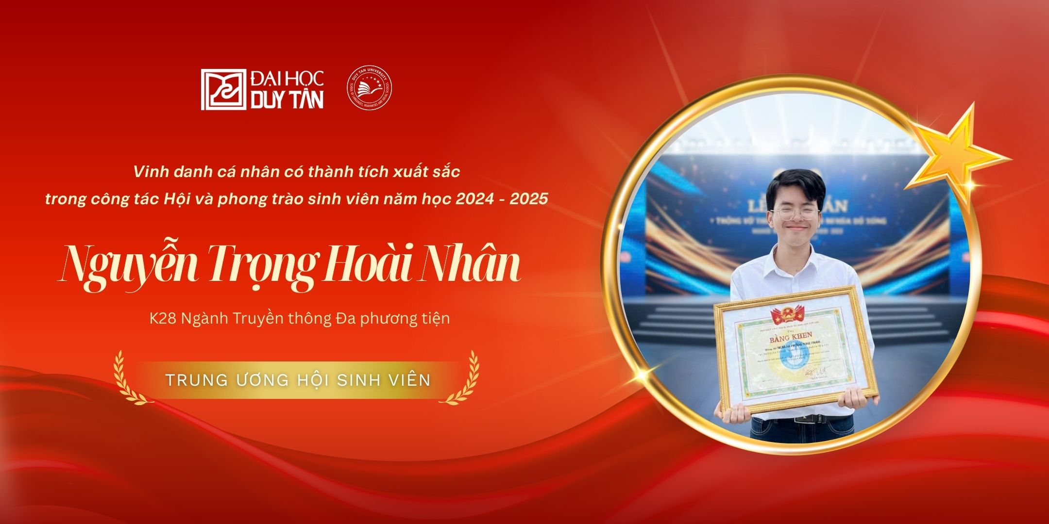 Trong không khí thi đua sôi nổi của năm học mới, Trường Ngôn ngữ - Xã hội Nhân văn (LHSS), Đại học Duy Tân liên tiếp đón nhận tin vui khi Trung ương Hội Sinh viên Việt Nam quyết định trao tặng Bằng khen cho tập thể CLB Báo chí & Truyền thông DTU JC Chance cùng hai cá nhân xuất sắc: Nguyễn Trọng Hoài Nhân và Hoàng Hương Lê. Đây là sự ghi nhận cao quý cho những nỗ lực bền bỉ trong công tác Hội và phong trào sinh viên thời gian qua.