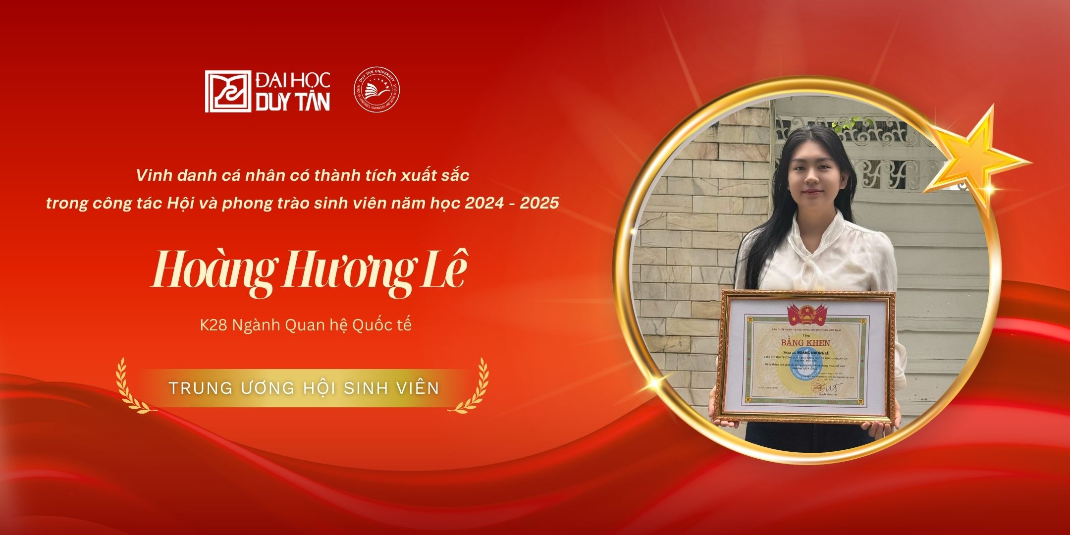 Cùng nhận vinh dự cao quý này là bạn Hoàng Hương Lê (K28 ngành Quan hệ Quốc tế) - một cá nhân luôn gây ấn tượng bởi sự năng động và nhiệt huyết. Hương Lê được biết đến là một sinh viên tích cực trong cả học thuật lẫn các hoạt động ngoại khóa. Với tư duy nhạy bén và kỹ năng tổ chức tốt, Lê đã đóng góp quan trọng vào thành công của nhiều chiến dịch truyền thông và thiện nguyện do Hội Sinh viên trường phát động. Sự ghi nhận từ Trung ương Hội đối với Hương Lê là lời khẳng định rằng: Tại LHSS, mỗi cá nhân đều có cơ hội để tỏa sáng nếu biết nỗ lực và dám đương đầu với thử thách.