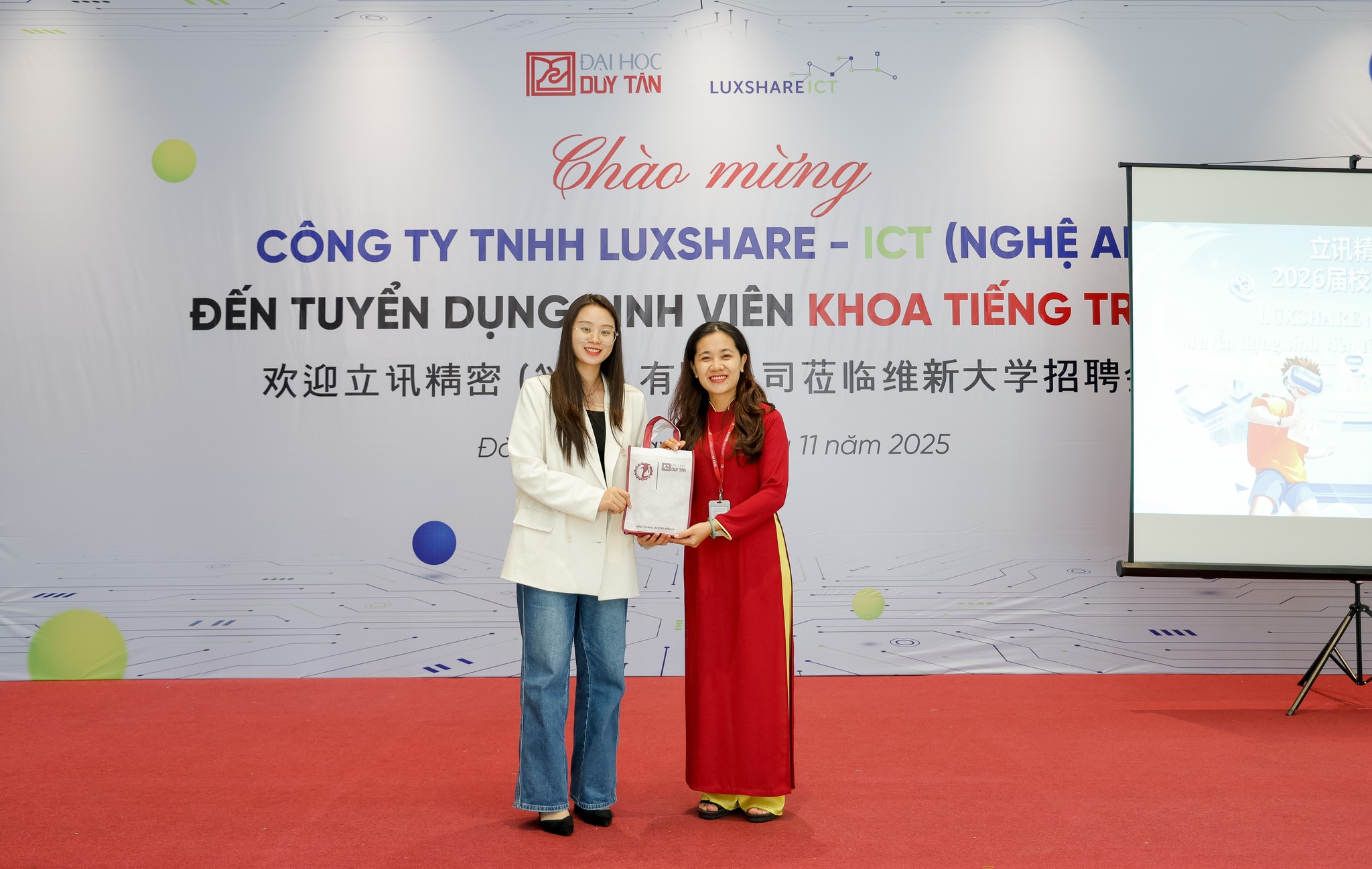 Chiều ngày 10/11/2025, không khí tại Đại học Duy Tân trở nên sôi động và đầy kỳ vọng khi Công ty TNHH Luxshare - ICT (Nghệ An) trực tiếp đến làm việc và tuyển dụng sinh viên Khoa Tiếng Trung. Đây là hoạt động hợp tác doanh nghiệp - nhà trường được duy trì nhiều năm qua, mở ra thêm những cơ hội nghề nghiệp hấp dẫn cho sinh viên sau khi tốt nghiệp.